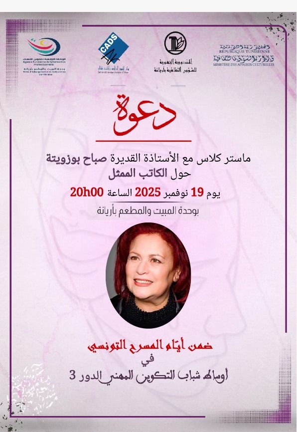 تنزل اليوم 19 نوفمبر الجاري الأستاذة والكاتبة والفنانة صباح بوزويتة ضيفة على ولاية أريانة لتشارك شباب التكوين المهني لقاءا حواريا ثقافيا مسرحيا حول ” الكاتب الممثل “وذلك بإدارة الأستاذة المبدعة وفاء الطبوبي ويندرج هذا اللقاء في اطار الدورة الثالثة لتظاهرة “أيّام المسرح التونسي في أوساط شباب التكوين المهني” الذي تنظمه المندوبية الجهوية للشؤون الثقافية بأريانة بالشراكة مع مركز الفنون الدّراميّة والركحيّة بأريانة ووحدة المبيت والمطعم بأريانة ووحدة المبيت والمطعم بقمرت وذلك من 17 إلى 22 نوفمبر الجاري وسيكون هذا اللقاء الفكري مناسبة تتاح لشباب التكوين المهني بالجهة وضمن سلسلة لقاءات فكرية وحوارية مع المبدعين للتعرّف على مسيرة المبدعة صباح بوزويتة ككاتبة وممثلة لها حضورها المتوهّج في الساحة الابداعية العربية والتونسية خاصة في مجال الفن الرابع باعتبارها ممثلة وكاتبة مسرحية ومخرجة تونسية…