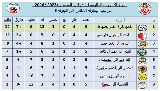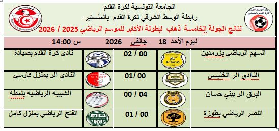 .. وفي ما يلي النتائج الكاملة في الجولة الخامسة التي دارت يوم الأحد 18 جانفي 26 20 :