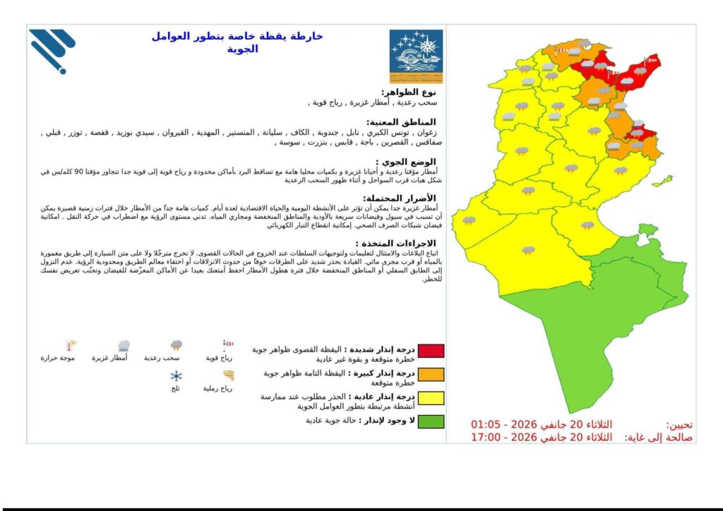 كما يتواصل الوضع الجوي يوم الغد الثلاثاء 20 جانفي 2026 ملائما لنزول الامطار بالشمال ومحليا الوسط والجنوب وتكون غزيرة في الصباح بالمناطق الساحلية الشمالية وأقصى الشمال الغربي.
