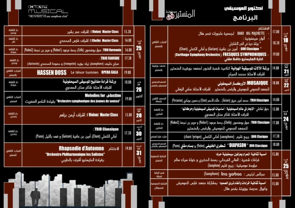 وتختتم التظاهرة يوم الخميس 31 أكتوبر 2025 بعرض ضخم بعنوان “Rhapsodie d’Automne” يقدّمه الأوركستر الفيلهارموني Les Solistes بقيادة المايسترو أشرف بالطيبي، ليكون مسك الختام لرحلة موسيقية ثرية جمعت العزف والغناء والإبداع في توليفة متناغمة بين الأجيال والاختصاصات.