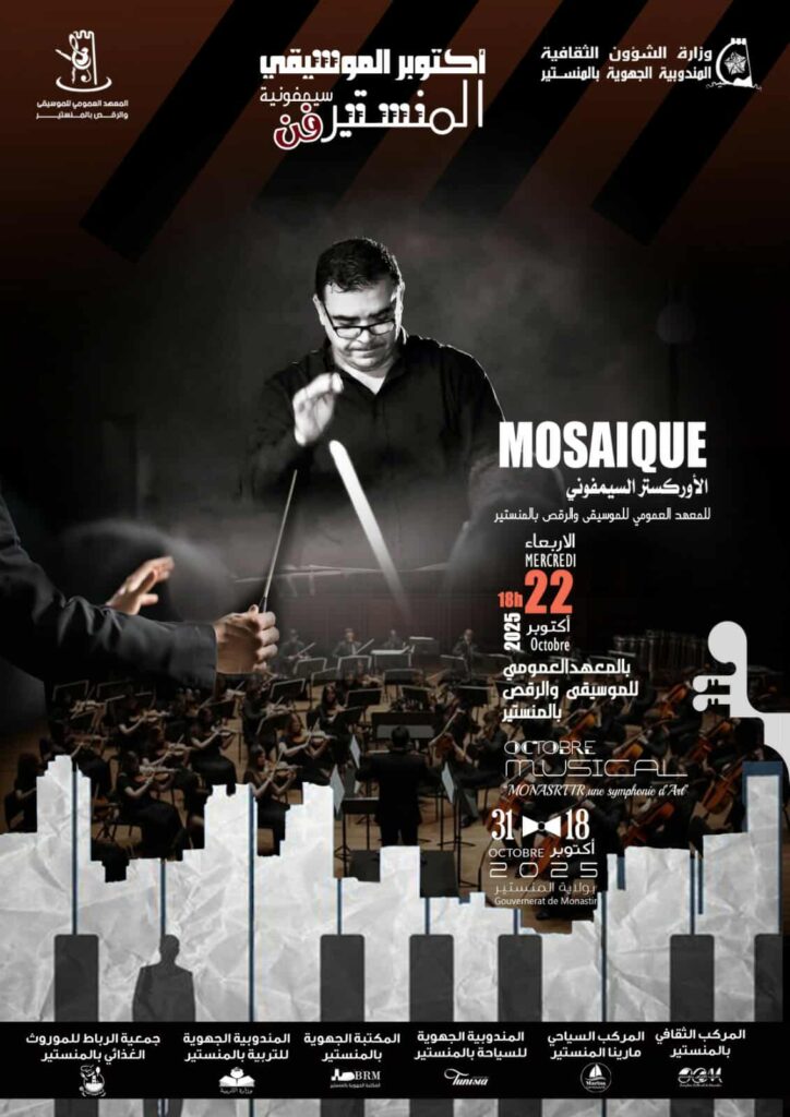 تتواصل فعاليات تظاهرة “المنستير سيمفونية فنّ” في إطار الاحتفال بشهر أكتوبر الموسيقي، تحت إشراف المندوبية الجهوية للشؤون الثقافية بالمنستير، وبالاشتراك مع المعهد العمومي للموسيقى والرقص بالمنستير وذلك من خلال السهرة الكبرى الثانية التي سيؤثّثها الأوركستر السيمفوني للمعهد العمومي للموسيقى والرقص بالمنستير تحت عنوان “MOSAÏQUE”، وذلك مساء اليوم الأربعاء 22 أكتوبر 2025 على الساعة السادسة مساءً (18:00) بفضاء المعهد العمومي للموسيقى والرقص بالمنستير.