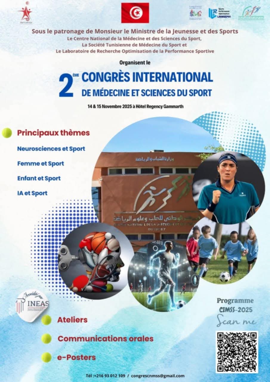 تحت إشراف وزارة الشباب والرياضة، يُنظم المركز الوطني للطب وعلوم الرياضة، المؤتمر الدولي الثاني لطب وعلوم الرياضة “CIMSS 2025 “، بالشراكة مع الجمعية التونسية للطب الرياضي ومخبر البحث “تحسين الأداء الرياضي”، وذلك على امتداد يومي الجمعة 14 والسبت 15 نوفمبر 2025 ابتداءً من الساعة التاسعة والنصف صباحا (09:30) بنزل ريجنسي – بقمرت.