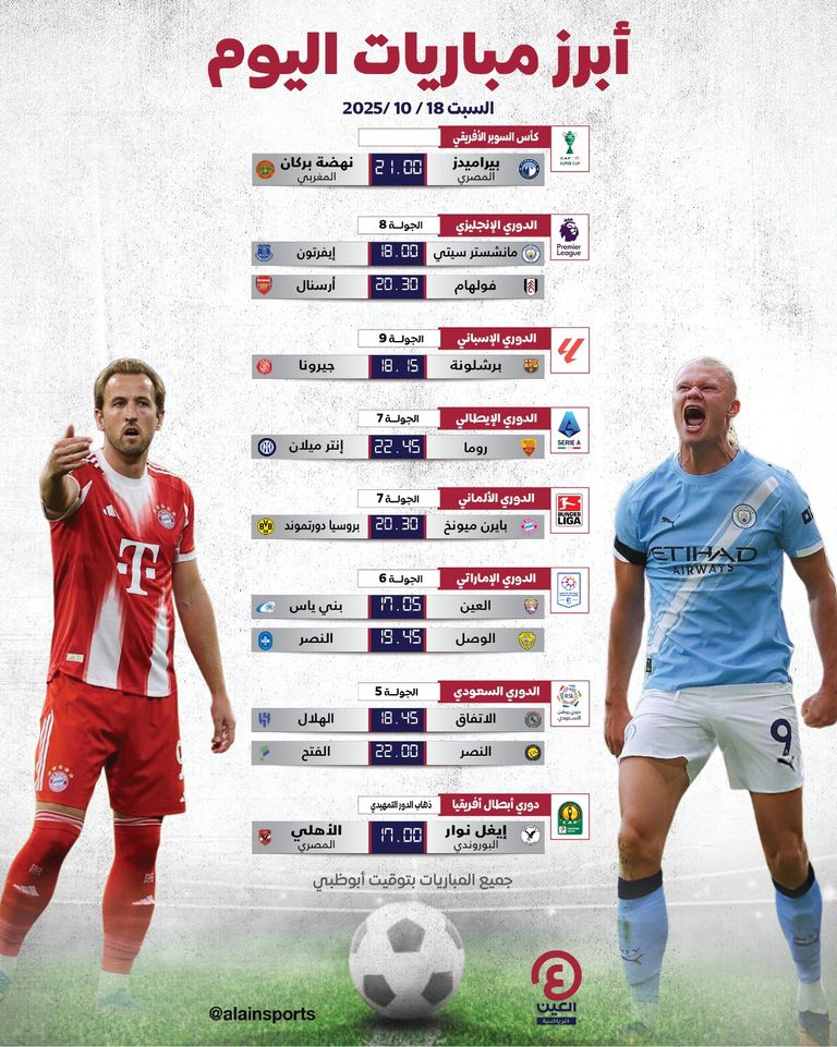 وفيما يلي، أبرز مباريات اليوم السبت 18 أكتوبر 2025 بالمواعيد والقنوات الناقلة لها.