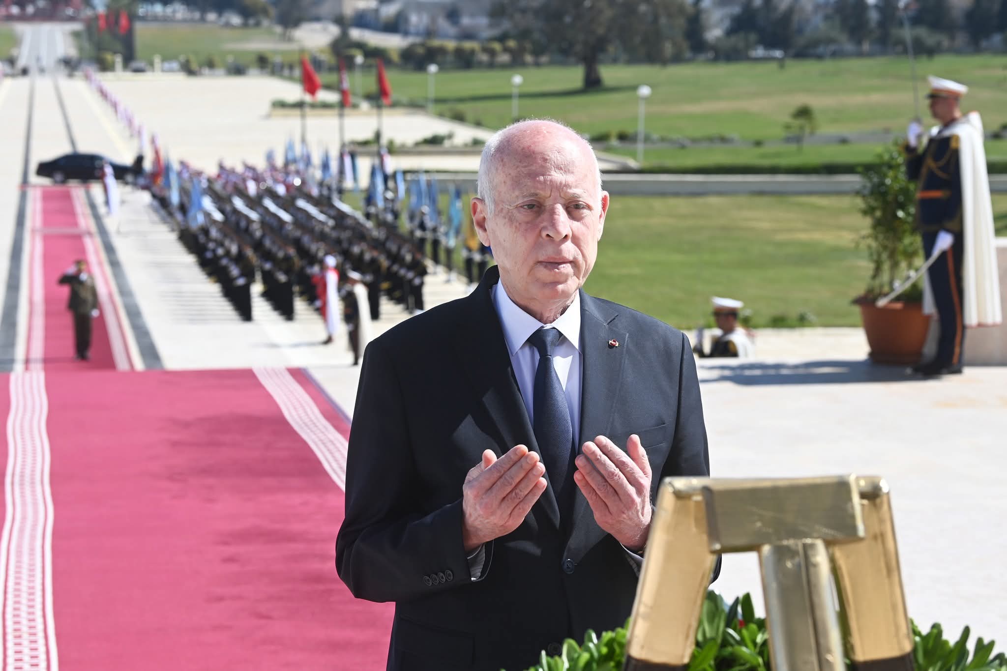 واستهلّ رئيس الدّولة الموكب بتحية العلم المفدى على أنغام النشيد الوطني، قبل أن يضع إكليلاً من الزهور أمام النصب التذكاري للشهداء، ويتلو فاتحة الكتاب ترحّماً على أرواحهم الطاهرة الزكية.