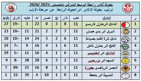 طوت بطولة رابطة الوسط الشرقي لكرة القدم بالمنستير يوم أمس الأحد 29 مارس 2026 جولتها الرابعة لمرحلة الإياب …. وقمة هذه الجولة جمعت المتصدر وصاحب الطليعة النادي الرياضي بمنزل فارسي بضيفه وجاره البرق الرياضي ببنی حسان صاحب المركز الثاني والملاحق العنيد والمنافس الأبرز في سباق البطولة من أجل الصعود إلى المستوى الثاني من رابطة الهواة… اذن انتھی “دربي” الجولة الرابعة إياب بالتعادل السلبي (0-0)… وبالتالي يحافظ نادي منزل فارسي على مركزه في طليعة الترتيب برصيد 27 نقطة، متقدما على صاحب المرتبة الثانية برق بنى حسان بأربع نقاط (رصيد البرق الرياضي بني حسان 23 نقطة) …