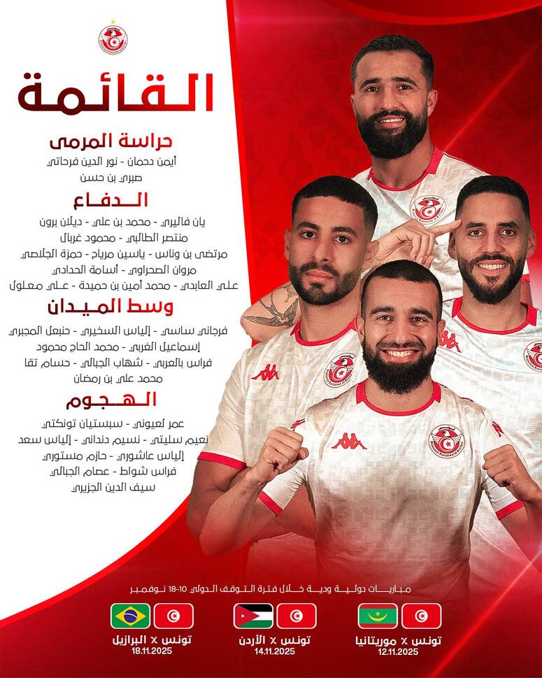 كشف الناخب الوطني سامي الطرابلسي اليوم الأحد، في البرنامج التلفزي “الأحد الرياضي” على قناة الوطنية الأولى، عن قائمة المنتخب التونسي لكرة القدم استعدادًا للمباريات الودية الثلاث القادمة أمام موريتانيا والأردن والبرازيل، المبرمجة من 12 إلى 18 نوفمبر الجاري ضمن النافذة الدولية لأيام الفيفا.
