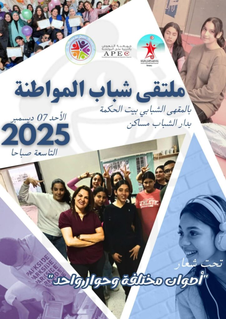 تحت شعار  ” أصوات مختلفة و حوار واحد” أقام المقهى الثقافي الشبابي “بيت الحكمة ” الذي تشرف على تنشيطه باقتدار الأستاذة سلوى بهلول، في دار الشباب مساكن يوم الاحد 7 ديسمبر 2025 نسخة مميزة وناجحة من ملتقى شباب نوادي التربية على المواطنة وذلك على هامش افتتاح أنشطة المقهى الثقافي الشبابي “بيت الحكمة” وقد افتتح الملتقى بتحية العلم على نغمات عزف فردي على آلة الكمان بحضور السيد عماد المصلى رئيس وحدة التنمية الأنشطة الشبابية ممثلا عن المندوبية الجهوية للشباب والرياضة بسوسة الى جانب السيدة حنان محجوب رئيسة جمعية النهوض بالتربية على المواطنة ثم السادة شفيق عصمان وعلي جلولي دون التغافل على ممثلي الجمعية في نوادي التربية على المواطنة بدور الشباب ومنشطي نوادي التربية على المواطنة بكل من المركب الشبابي سهلول ودور الشباب في البحاير حمام سوسة وسيدي بوعلي والقلعة الصغرى.