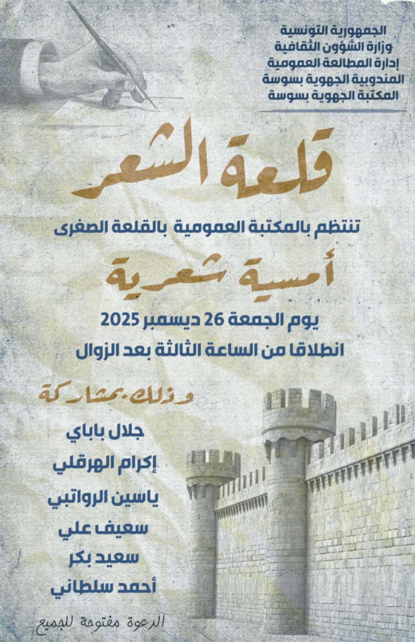 ضمن انشطتها المستحدثة وبمناسبة حلول العطلة المدرسية الشتوية، تضرب المكتبة العمومية بالقلعة الصغرى يوم الجمعة 26 ديسمبر 2025 ابتداء من الثالثة مساء، موعدا رشيقا مع أمسية شعرية التي اختار لها المنظمون عنوانا لافتا :” قلعة الشعر” عاكسة فسيفساء من تجارب شعرية متفاوتة المناخات ومختلفة القوالب النمطية للقصيدة في ابهى تجلياتها الزمكانية وذلك بمشاركة الشعراء: جلآل باباي، سعيف علي، إكرام الهرقلي ، أحمد السلطاني، ياسين الرواتبي وسعيد بكر.. لتستقيم بذلك مدينة القلعة الصغرى أقرب إلى وجهة وارفة بالانوار ذات شتاء إبداعي العطور تضيئه فوانيس القصيدة ليكتمل المشهد الثقافي وتُنحت ملحمة “قلعة الشعر” التي ننتظر ان تستجييب للذائقة الجماعية وتروق لعشاق القلم والقرطاس.