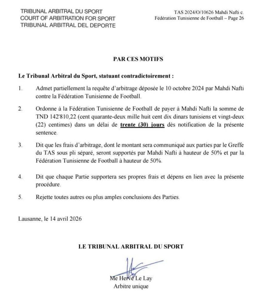 ذكرت الجامعة التونسية لكرة القدم أنها تلقت بتاريخ 13 أفريل 2026 قرار محكمة التحكيم الرياضي الدولية (TAS) بخصوص الدعوى المرفوعة من المدرب مهدي النفطي ضد الجامعة، إثر فسخ العلاقة التعاقدية بين الطرفين.