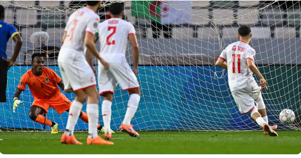 وحصلت تونس على ركلة جزاء عقب تدخل حكم الفيديو المساعد “في ايه آر” اثر خطأ ارتكبه المدافع ابراهيم حمد على إلياس العاشوري داخل المنطقة بعد ركلة حرة جانبية (41)، فانبرى لها الغربي على يسار الحارس مالاسانغا (43).
