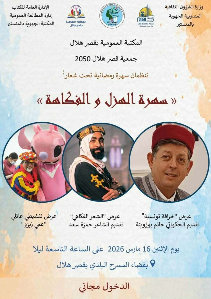 وسيكون حفل اختتام الأنشطة الثقافية اليوم الإثني الرمضانية 2026 16 مارس من خلال سهرة الهزل والفكاهة .. من تنظيم جمعية “قصر هلال 2050 ” وذلك بفضاء المسرح البلدي بقصر هلال انطلاقا من الساعة التاسعة ليلا .. والدخول مجاني .. وتتضمن السهرة عرض “خرافة تونسية” للحكواتي حاتم بو زوينة وعرض “الشعر الفكاهي” يقدمه الشاعر حمزة . سعد، بالإضافة إلى عرض تنشيطي عائلي “عمي زيزو” …