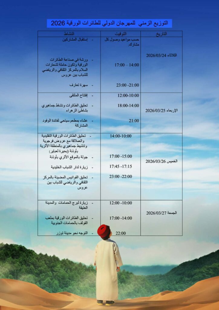 انعقدت أول أمس الخميس 12 مارس 2026 الندوة الصحفية الخاصة بالمهرجان الدولي للطائرات الورقية الذي ينظمه المركز الثقافي والرياضي للشباب ببن عروس بالشراكة مع المركب الشبابي بنفطة والجمعية التونسية للطائرات الورقية “One Tunisia Kite Team” والديوان الوطني التونسي للسياحة وبالتعاون مع المندوبية الجهوية للشباب والرياضة ببن عروس ودور الشباب بحمام الأنف والزهراء والخليدية والمتنقلة بن عروس من 24 الى 31 مارس 2026 وتحت إشراف وزارة الشباب والرياضة والحي الوطني الرياضي.
