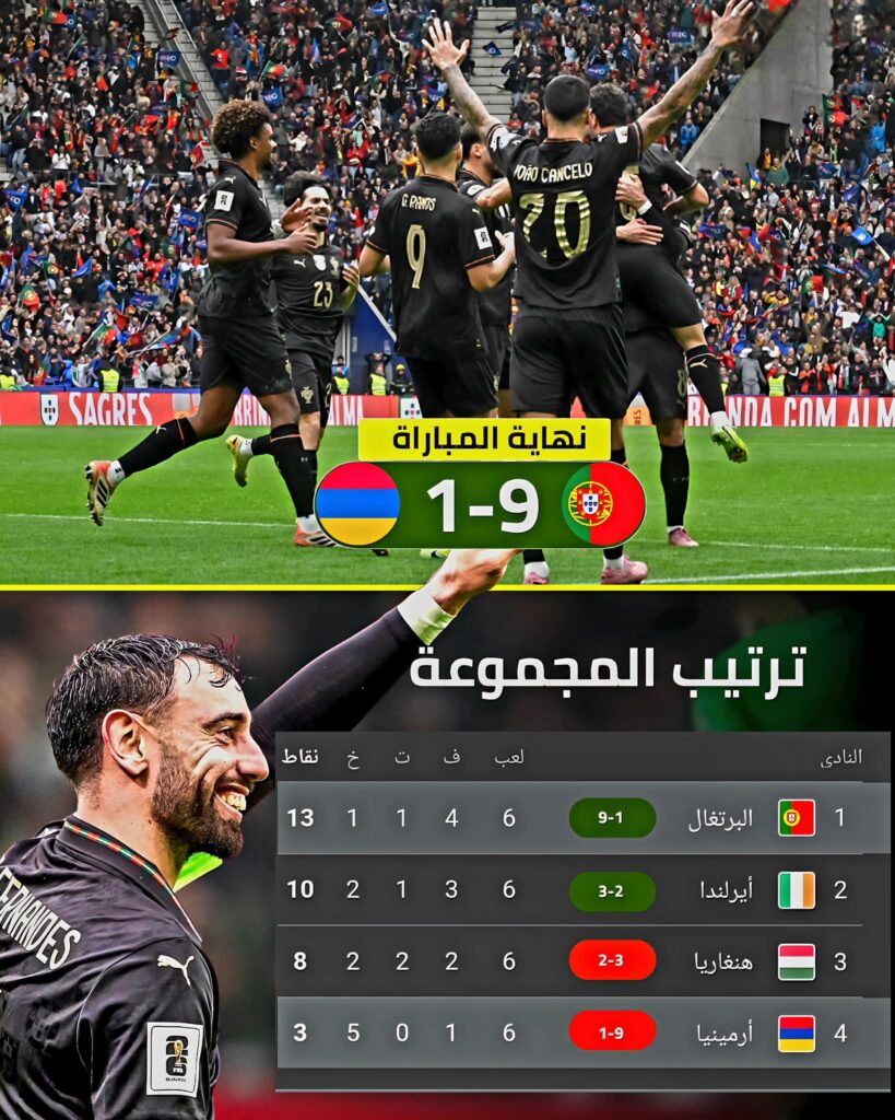 سجل برونو فرنانديز ثلاثية من بينها ركلتا جزاء ليقود البرتغال في غياب نجمها كريستيانو رونالدو لفوز ساحق 9-1 على ضيفتها أرمينيا والتأهل لنهائيات كأس العالم لكرة القدم في أمريكا الشمالية.