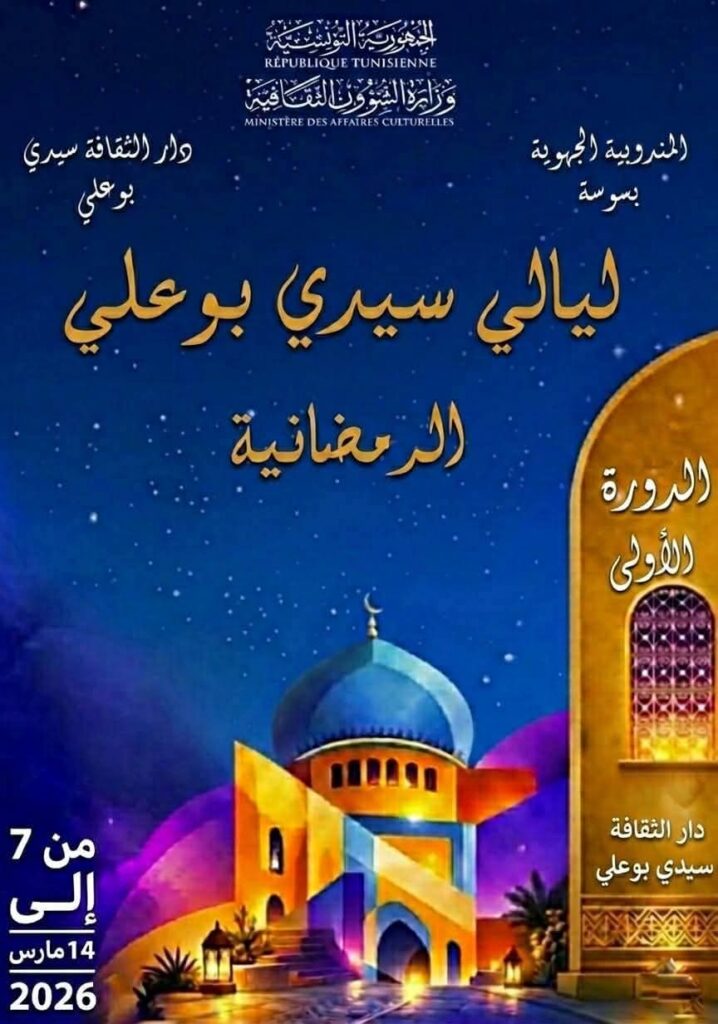 تضرب دار الثقافة سيدي بوعلي من 7 إلى 14 مارس 2026 موعدا جديدا ورائقا مع سمٌار ليالي رمضان المبارك في دورة أولى من ليالي سيدي بوعلي الرمضانية التي تنتظم تحت إشراف المندوبية الجهوية للشؤون الثقافية بسوسة