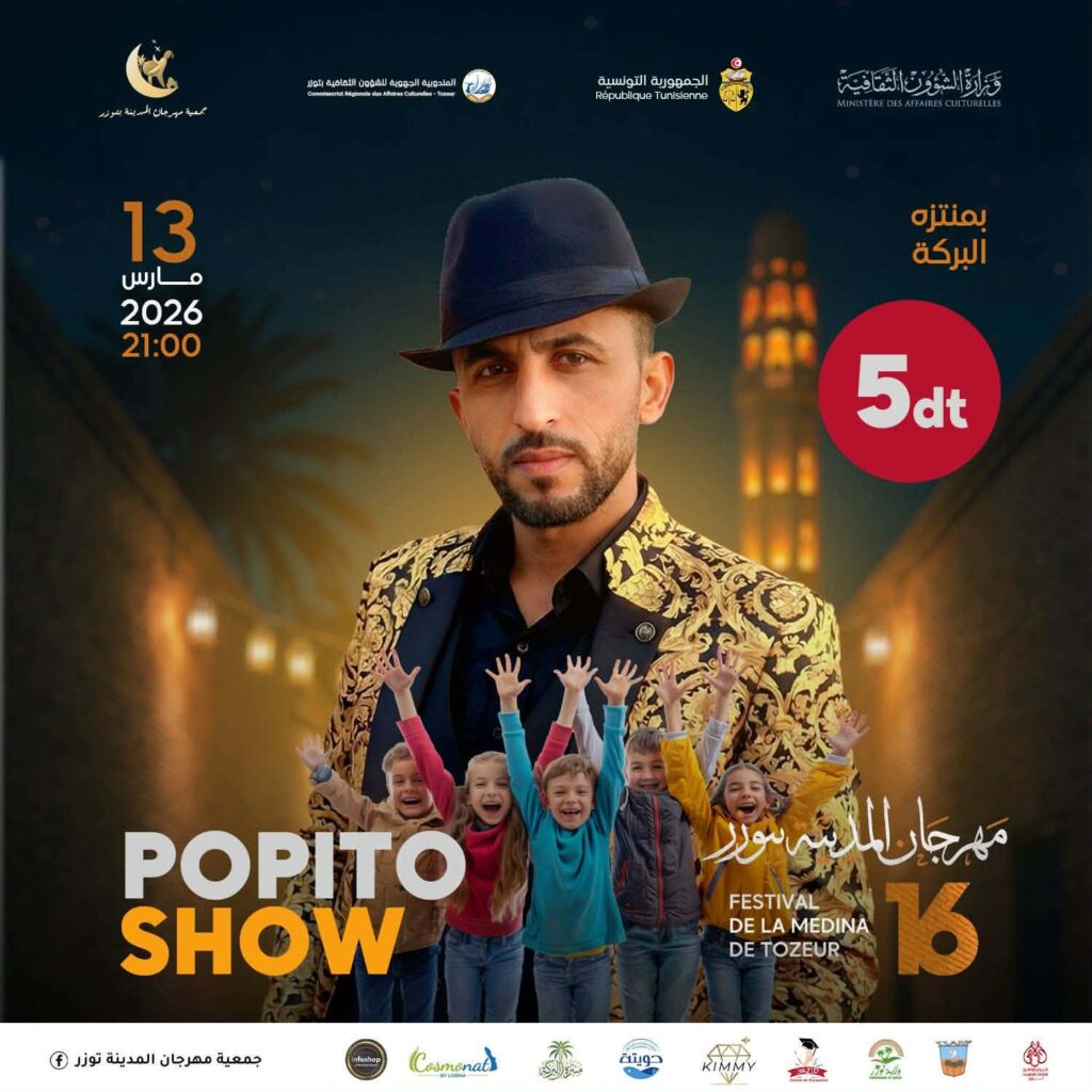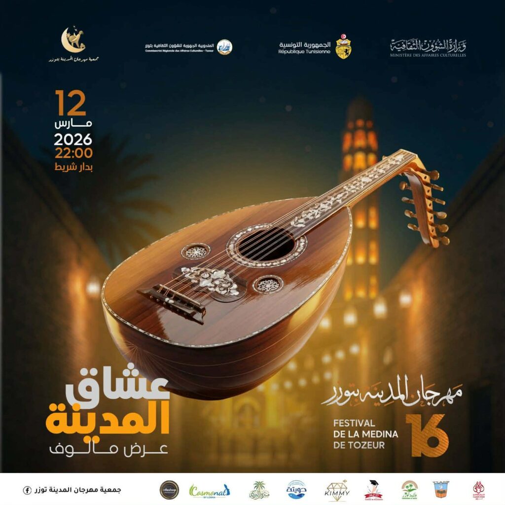 وإلى جانب هذه السهرة “الحدث”، سيلتقي عشاق الفن الصوفي ونواويره في سهرة ليلة يوم الإثنين 9 مارس مع عرض صوفي روحاني بعنوان “عشاق المدينة” ستؤثثه فرقة سليم بن عبد الله، سيليه في سهرة ليلة يوم الثلاثاء 10 مارس عرض موسيقي شبابي بعنوان “DJJOk3R”. أما في سهرة ليلة الخميس 12 مارس فقد خصت جمعية مهرجان المدينة بتوزر جمهور هذه التظاهرة الرمضانية المتميزة بعرض موسيقي بعنوان “مالوف لعشاق المدينة”. كما سيحتض فضاء متنزه البركة بتوزر في سهرة ليلة يوم الجمعة 13 مارس عرضا موجها للأطفال والعائلات بعنوان “POPiTO”، ليسدل الستار على فعاليات الدورة السادسة عشرة لمهرجان المدينة بتوزر في سهرة ليلة يوم السبت 14 مارس بعرض فني سيحيه الفنان احمد الشريف وذلك بفضاء متحف شريط بالمنطقة السياحية بتوزر. وسيقام هذا العرض بالشراكة مع دار الثقافة أبو القاسم الشابي.