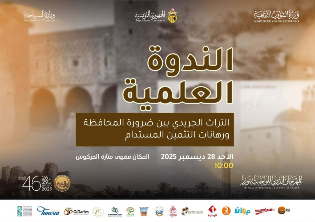 وإلى جانب هذه الإحتفالية العرسية إلتأمت أيضا في صبيحة هذا اليوم الثالث للمهرجان بفضاء مقهى منارة الفركوس بتوزر ندوة علمية بعنوان “التراث الجريدي بين ضرورة المحافظة ورهانات التثمين المستدام”، أثثها نخبة هامة وقيمة من الباحثين والمختصين والمهتمين بالتراث بربوع الجريد في كل مناحيه وأغراضه خاصة وأن ربوع الجريد لها أرث تراثي غني.