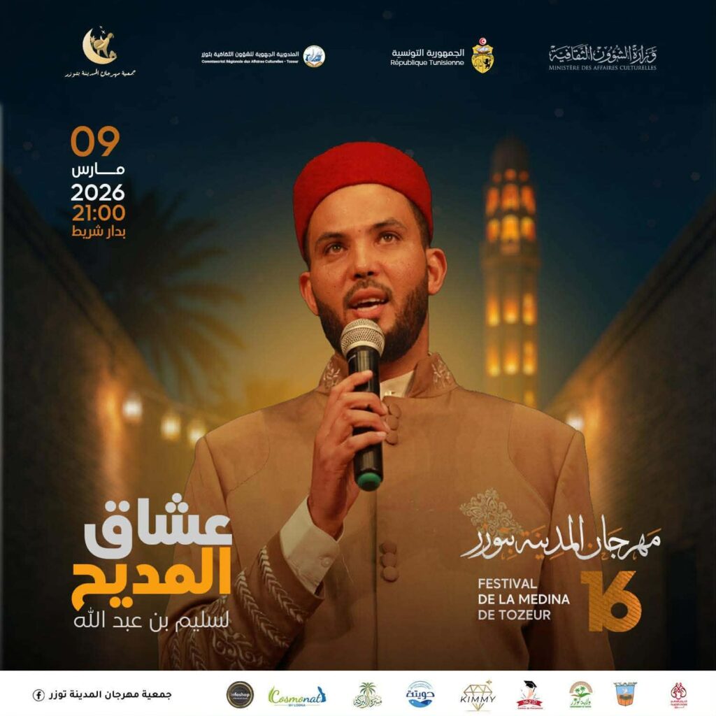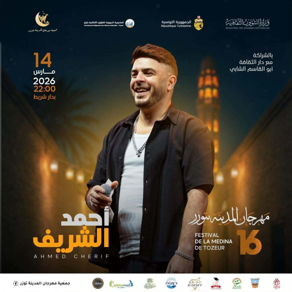 بعد مضي ست سهرات كانت عروضها قد لامست الإبداع وحققت لجماهيرها الإمتاع والإنتشاء، سيسدل في سهرة ليلة اليوم السبت 14 مارس الستار على فعاليات الدورة السادسة عشرة لمهرجان المدينة بتوزر، الذي كانت برمجة عروضه قد إنطلقت منذ ليلة 7 مارس، وذلك بعرض فني طربي سيحييه الفنان أحمد الشريف سيحتضنه فضاء متحف دار شريط التاريخي، الذي كان إحتضن معظم عروض هذا المهرجان فزادها سحرا ورونقا وتأنقا.