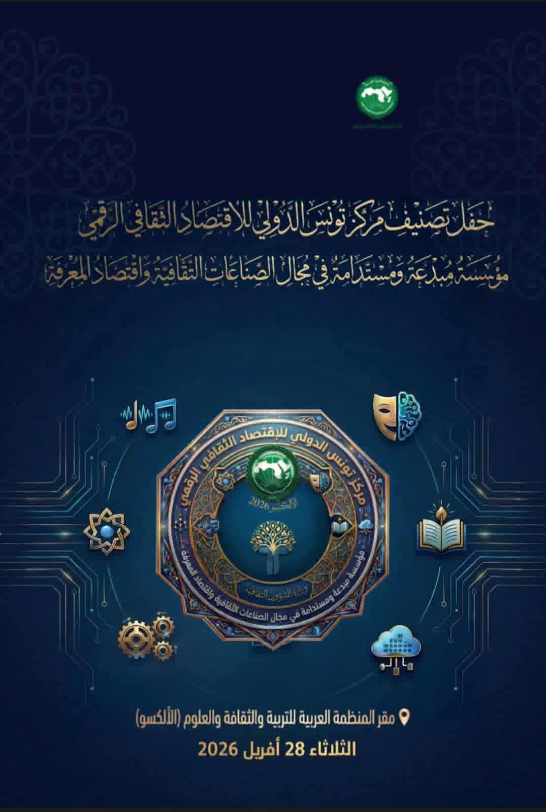 تنظّم المنظمة العربية للتربية والثقافة والعلوم (الألكسو) بمقرّها الكائن بشارع محمد علي عقيد بالمركز العمراني الشمالي بتونس العاصمة صباح يوم الثلاثاء 28 أفريل الجاري وبحضور عدد هام من المسؤولين والشخصيات الرسمية والخبراء، إلى جانب الفاعلين في مجالات الثقافة والابتكار والإعلام حفلا لتصنيف مركز تونس الدولي للاقتصاد الثقافي الرقمي وذلك في إطار برنامج المنظمة الخاص بتصنيف المؤسسات الثقافية العربية بوصفها مبدعة ومستدامة ومستجيبة لمعايير الجودة والحوكمة الرشيدة وضمن أحد أبرز المبادرات التي أطلقتها الألكسو، بهدف دعم العمل الثقافي العربي المشترك، وضمان تبادل أفضل الممارسات، وتعزيز التعاون بين المؤسسات الثقافية المعتمدة، في إطار مبادئ المؤسساتية، والمشاركة، والشفافية، والانفتاح على التجارب الدولية، وتقاسم النماذج الملهمة في حوكمة الثقافة.