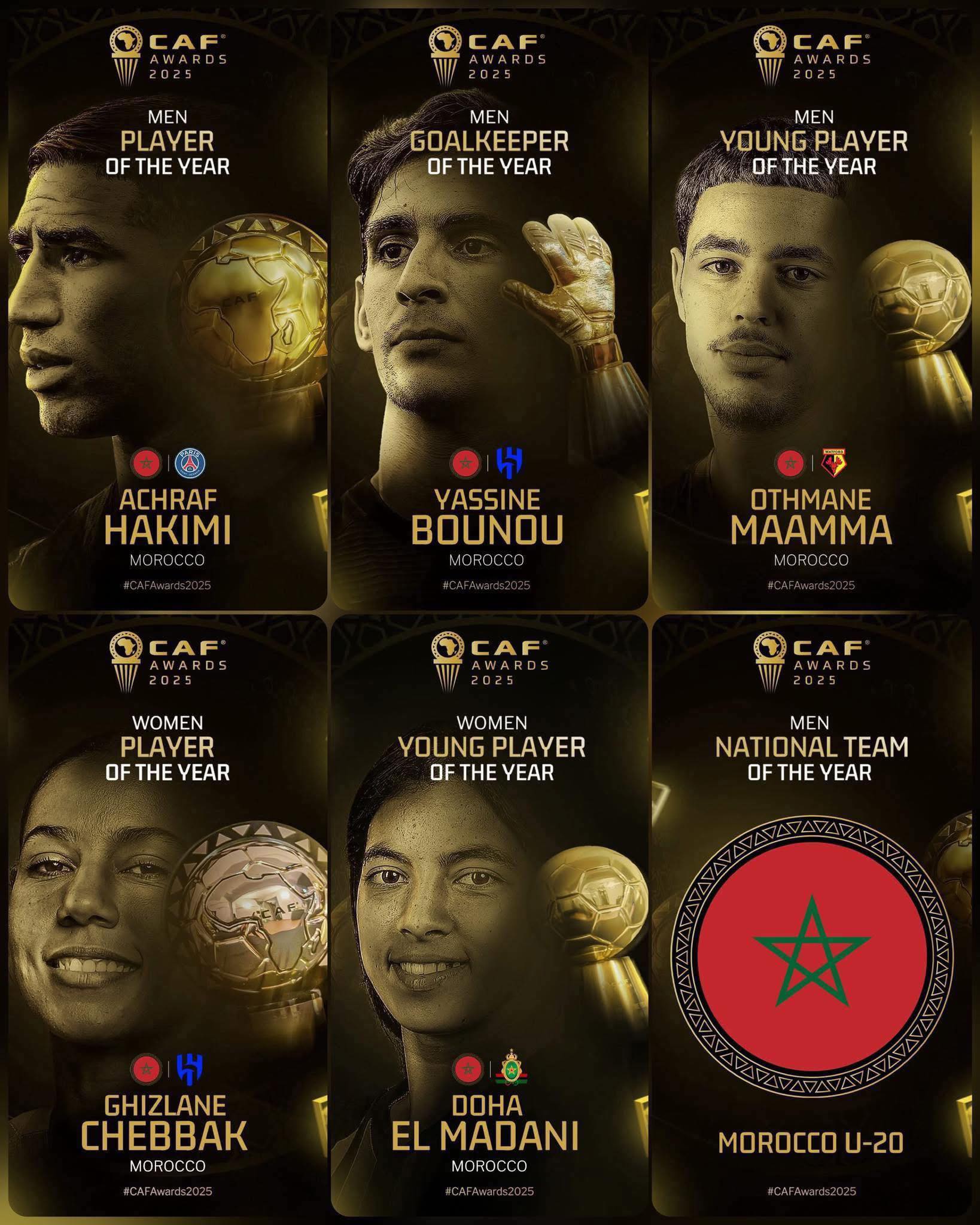 فقد تُوجت النجمة المغربية غزلان الشباك بجائزة أفضل لاعبة إفريقية، وحصد “العملاق” المغربي ياسين بونو جائزة أفضل حارس مرمى في القارة الإفريقية لعام 2025، ليضيف هذا الإنجاز إلى سجله المليء بالتألق.