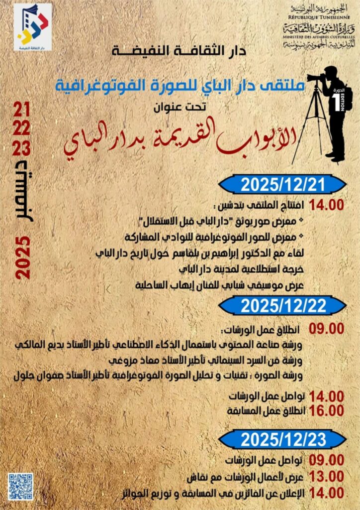 وحال اطلاعنا على فقرات البرنامج العام لهاته التظاهرة التي تتواصل على مدى ثلاثة ايام. وقد امدتنا مديرة دار الثقافة الأستاذة جنات العابد بمعطيات ضافية وشافية حول فحوى ما تيسٌر من فقرات الأيام التي تنطلق يوم الأحد 21 ديسمبر 2025 بتدشين معرض لصور توثق ” دار الباي قبل الإستقلال” اضافة إلى معرض الصور الفوتوغرافية للنوادي المشاركة . ثم ينتظم لقاء مع الدكتور ابراهيم بن بلقاسم للإدلاء بشهادة حول تاريخ دار الباي وإثرها يقترح القائمون على الملتقى خرجة استطلاعية للمشاركين إلى مدينة دار الباي لتشهد الفترة المسائية بعدها عرضا موسيقيا شبابيا بإمضاء إيهاب الساحلية . أما صبيحة يوم 22 ديسمبر فيعرف انطلاق عمل الورشات الفنية من ذلك ورشة صناعة المحتوى باستعمال الذكاء الإصطناعي تأطير الأستاذ بديع المالكي وورشة الفن السردي تاطير الأستاذ معاذ المزوغي ثم ورشة الثورة : تقنيات وتحليل الصورة الفوتوغرافية تأطير صفوان جلول . وفي حدود الرابعة مساء تفتتح أشغال المسابقة. في حين يتضمن صباح يوم 23 ديسمبر عرض عمل الورشات ومناقشتها ويعلن في الساعة الثانية ظهرا عن نتائج المسابقة وتتويج الفائزين.