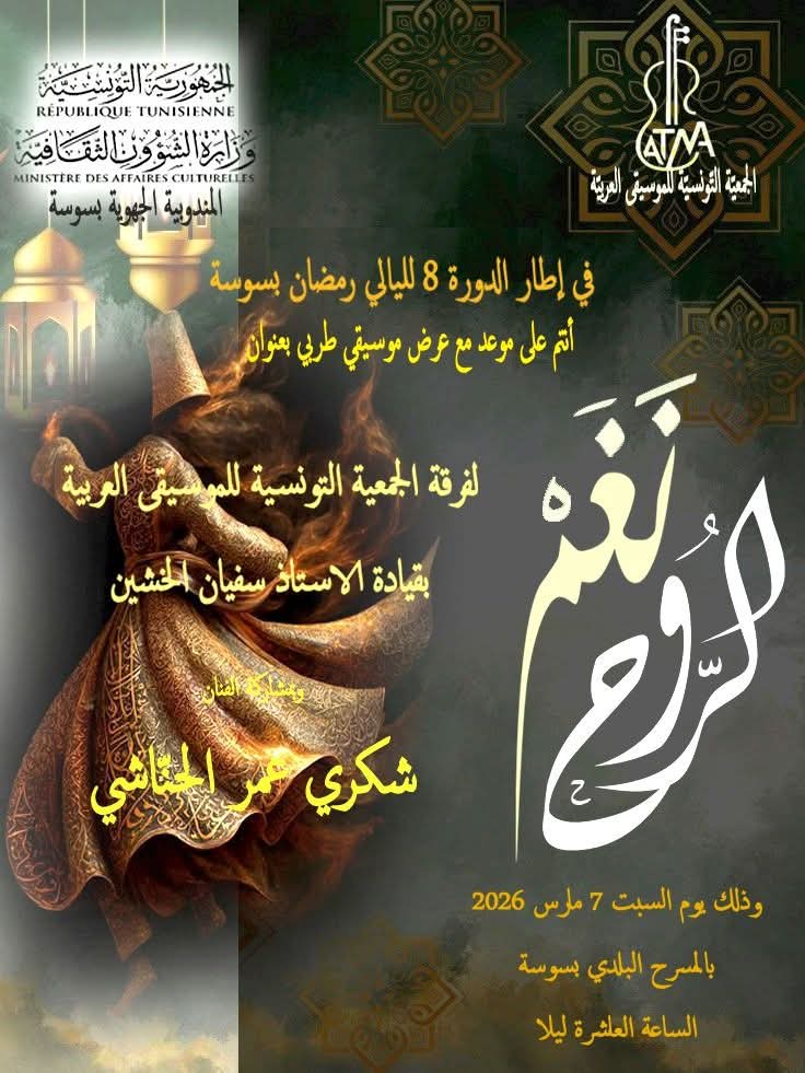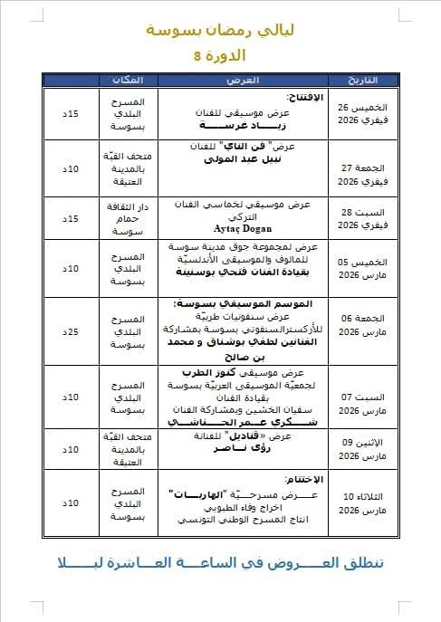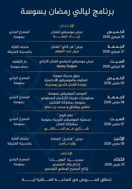 في إطار تنشيط المشهد الثقافي لمدينة سوسة خلال شهر رمضان المعظم، تنظم المندوبية الجهوية للشؤون الثقافية الدورة الثامنة لتظاهرة ليالي رمضان ” إنطلاقا من يوم غد الخميس 26 فيفري 2026 لتواصل حتى يوم 10 مارس 2026 . . وتتوزع العروض على 3 فضاءات ثقافية وهي : متحف القبة بالمدينة العتيقة والمسرح البلدي بسوسة ودار الثقافة بحمام سوسة …. وستكون الإنطلاقة غدًا الخميس 26 فيفري 2026 ضمن عرض الافتتاح مع الفنان زياد غرسة بالمسرح البلدي بمدينة سوسة .. والفرصة متاحة لأحباء المالوف لمتابعة سهرة موسيقية رائقة وراقية مع الموشحات الأندلسية والمالوف التونسي الأصيل… وفي ما يلي برنامج بقية العروض :
