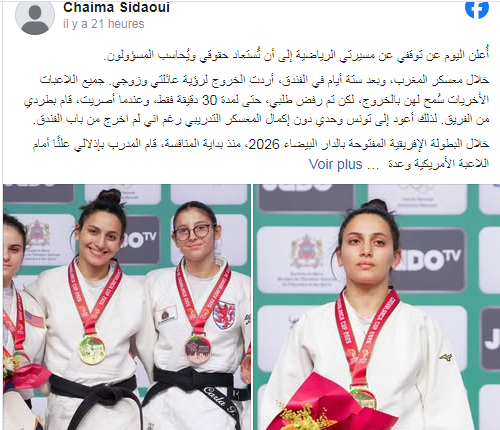 أعلنت بطلة الجودو شيماء صيداوي، الثلاثاء 27 جانفي، قرارها إيقاف مسيرتها الرياضية مؤقتًا إلى حين استرجاع حقوقها ومحاسبة المسؤولين عمّا وصفته بتجاوزات خطيرة تعرّضت لها خلال مشوارها الرياضي.