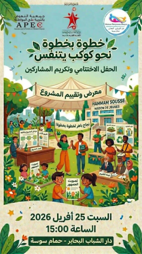 عاشت دار الشباب البحاير حمام سوسة يوم 25 أفريل على ايقاع اختتام المشروع المواطني الشبابي والبيئي :” خطوة بخطوة نحو كوكب يتنفس ” بالتعاون مع جمعية النهوض بالتربية على المواطنة ليسدل الستار على فعالياته بعد جهود ثمنها كل من استفاظ من فقراتها التوعوية والتحسيسية بقيمة المحيط والمحافظة على البيئة والسعي لنشر:الوعي في صفوف المواطنين ومتساكني بلدية حمام سوسة وما جاورها …