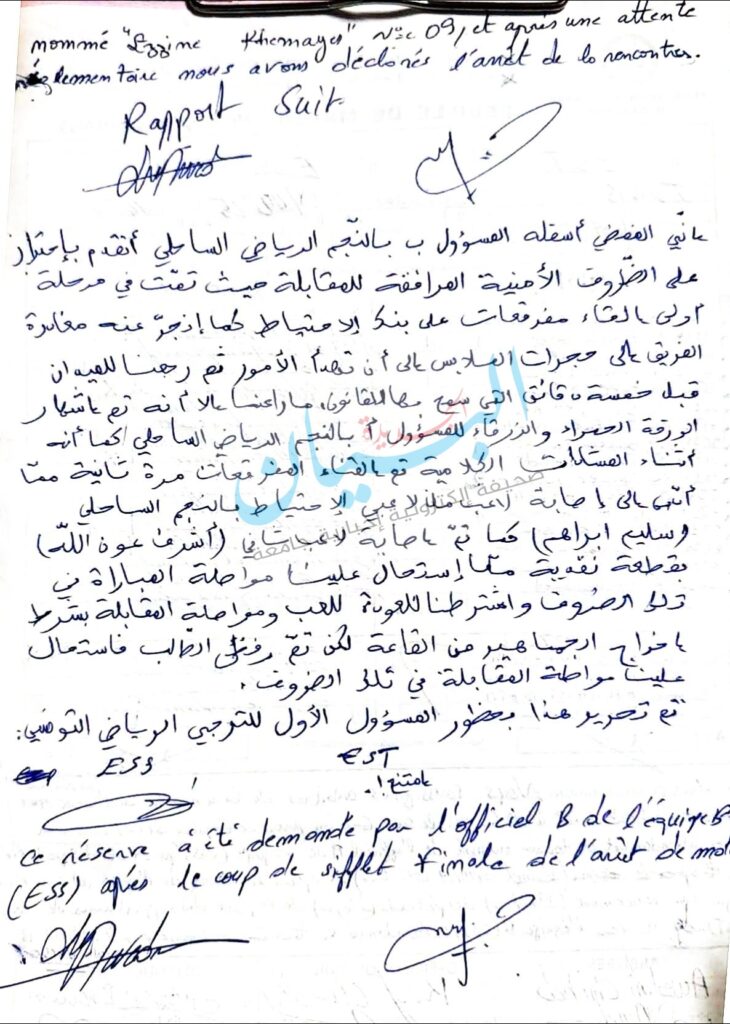 إنني الممضي أسفله المسؤول بالنجم الرياضي الساحلي أتقدم بإحتراز على الظروف الأمنية المرافقة للمقابلة حيث تمت في مرحلة أولى القاء مفرقعات على بنك الاحتياط مما إنجر عنه مغادرة الفريق الى حجرات الملابس إلى أن تهدأ الأمور ثم رجعنا للميدان قبل خمس دقائق التي سمح بها القانون، ما راعنها الا أنه تم إشهار الورقة الحمراء والزرقاء للمسؤول أ بالنجم الرياضي الساحلي كما أنه أثناء المشادات الكلامية تم إلقاء المفرقعات مرة ثانية مما أدى إلى إصابة لاعب من لاعبي الاحتياط بالنجم الساحلي (سليم ابراهم) كما تم اصابة لاعب ثاني (أشرف عون الله) بقطعة نقدية مما إستحال علينا مواصلة المباراة في تلك الظروف واشترطنا للعودة للعب ومواصلة المقابلة شرط خروج الجماهير من القاعة لكن تم رفعدض الطادلب فاستحال علينا مواطة المقابلة في تلك الظروف.